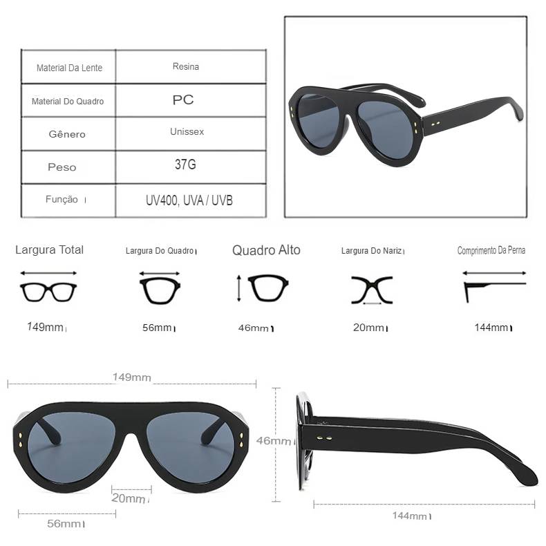 Nossos óculos de sol são modernos, atualizados e oferecem o mais alto nível de proteção UVA/UVB.  Eles são feitos com materiais resistentes, duráveis e leves para garantir conforto por muitas horas seguidas.